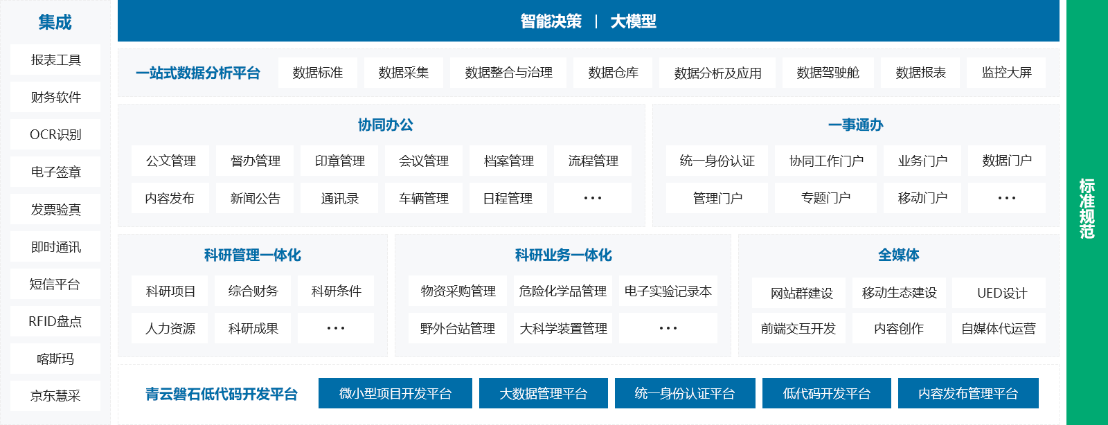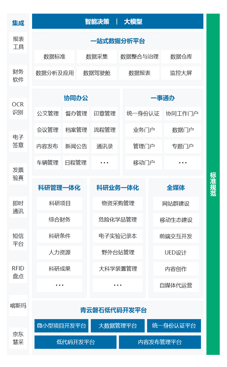 輔助決策平臺(tái)是基于科研數(shù)據(jù)和科研指標(biāo),利用先進(jìn)算法、可視化、大模型等技術(shù),為科研決策者提供數(shù)據(jù)支持和建議的信息化系統(tǒng)。平臺(tái)為科研單位建立數(shù)據(jù)標(biāo)準(zhǔn),搭建數(shù)據(jù)中臺(tái),將內(nèi)外部科研數(shù)據(jù)進(jìn)行有機(jī)融合,讓科研決策者一手掌握本單位科研項(xiàng)目、經(jīng)費(fèi)、資產(chǎn)、科研成果、人才隊(duì)伍建設(shè)情況,了解國(guó)家/同行業(yè)單位發(fā)展趨勢(shì),找準(zhǔn)本單位科研水平所處位置,制定人才引進(jìn)、經(jīng)費(fèi)申請(qǐng)、資源配置相關(guān)制度和戰(zhàn)略規(guī)劃,從而提升本單位整體科研能力。